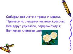 Слайд 26 Собирал все лето я травы и цветы. Принесу на лекцию частицу красоты. Все вдруг удивятся, гордым буду я; Вот какая классная моя коллекция