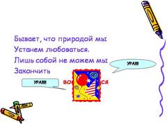 Слайд 17 Бывает, что природой мы Устанем любоваться. Лишь собой не можем мы Закончить восторгаться УРА. УРА.