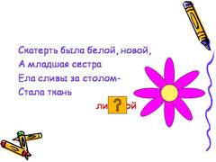 Слайд 14 Скатерть была белой, новой, А младшая сестра Ела сливы за столом- Стала ткань лиловой