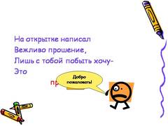 Слайд 8 На открытке написал Вежливо прошение, Лишь с тобой побыть хочу- Это приглашение Добро пожаловать!