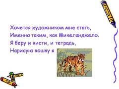 Слайд 21 Хочется художником мне стать, Именно таким, как Микеланджело. Я беру и кисти, и тетрадь, Нарисую кошку я оранжевой