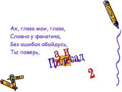 Слайд 13 Ах, глаза мои, глаза, Словно у фанатика, Без ошибок обойдусь, Ты поверь, грамматика Полесад а 2 и