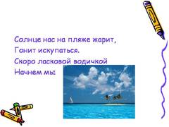 Слайд 18 Солнце нас на пляже жарит, Гонит искупаться. Скоро ласковой водичкой Начнем мы наслаждаться