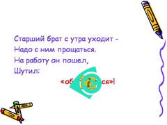 Слайд 20 Старший брат с утра уходит - Надо с ним прощаться. На работу он пошел, Шутил: «обогащаться»!