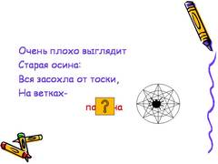 Слайд 23 Очень плохо выглядит Старая осина: Вся засохла от тоски, На ветках- паутина