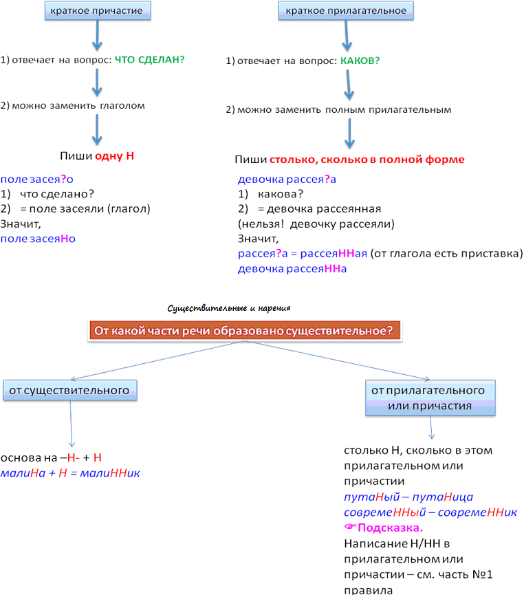 1. Определи, какой частью речи являются слова, в которых пропущены –Н- или –НН-. Это необходимо для того, чтобы знать, какой часть правила пользоваться.