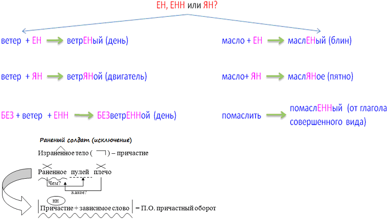 Несмотря на то, что в кодификаторе говорится об одной и двух буквах Н в суффиксах различных частей, в контрольных измерительных материалах мы будем иметь дело и со словами, в которых написание двух Н обусловлено тем, что первая из букв является частью корня (основы), а вторая — суффикс -Н- или часть суффикса, начинающегося на Н.
