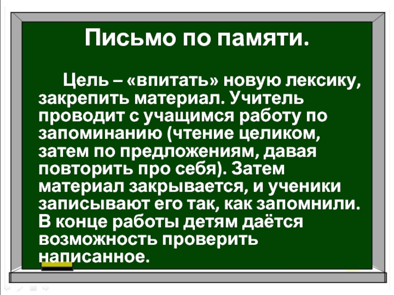 Цель – «впитать» новую лексику, закрепить материал. Учитель проводит с учащимся работу по запоминанию (чтение целиком, затем по предложениям, давая повторить про себя). Затем материал закрывается, и ученики записывают его так, как запомнили. В конце работы детям даётся возможность проверить написанное.