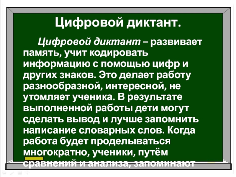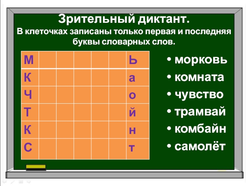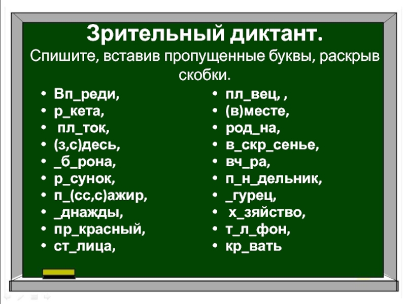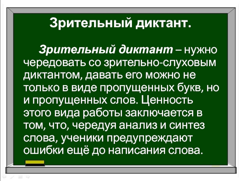 Зрительный диктант – нужно чередовать со зрительно-слуховым диктантом, давать его можно не только в виде пропущенных букв, но и пропущенных слов. Ценность этого вида работы заключается в том, что, чередуя анализ и синтез слова, ученики предупреждают ошибки ещё до написания слова.
