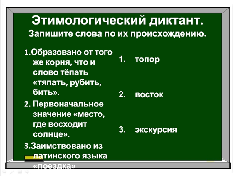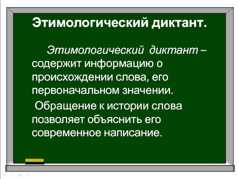 Этимологический диктант – содержит информацию о происхождении слова, его первоначальном значении.