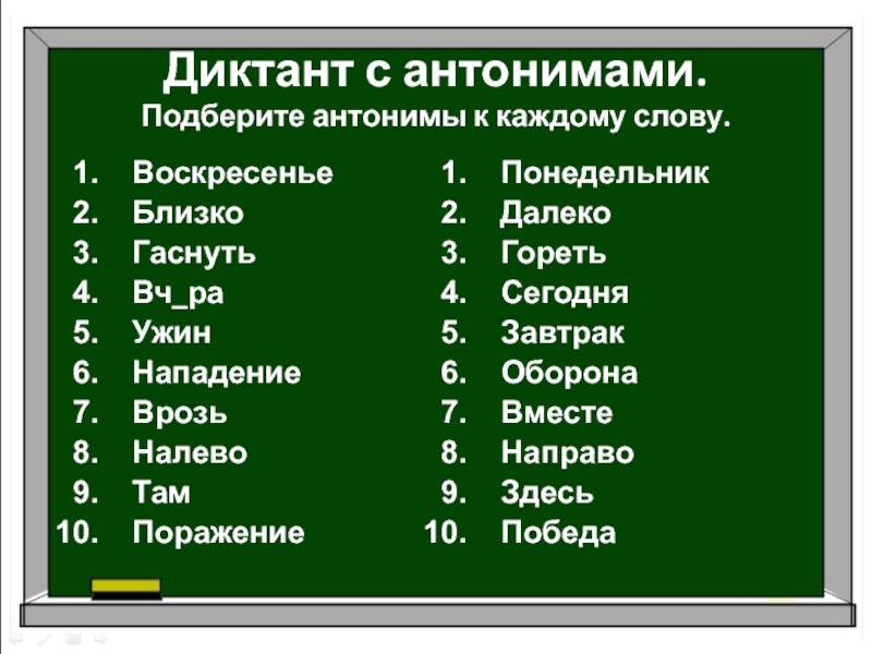 Диктант с антонимами. Подберите антонимы к каждому слову.