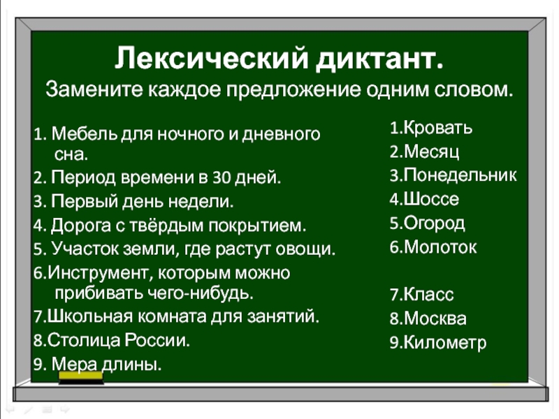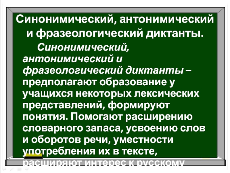 Синонимический, антонимический и фразеологический диктанты – предполагают образование у учащихся некоторых лексических представлений, формируют понятия. Помогают расширению словарного запаса, усвоению слов и оборотов речи, уместности употребления их в тексте, расширяют интерес к русскому языку.