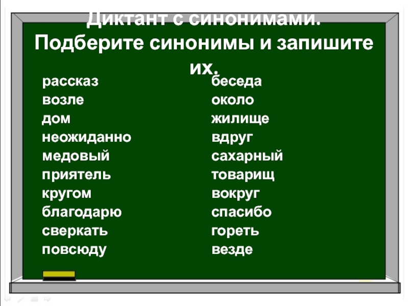 Диктант с синонимами. Подберите синонимы и запишите их.