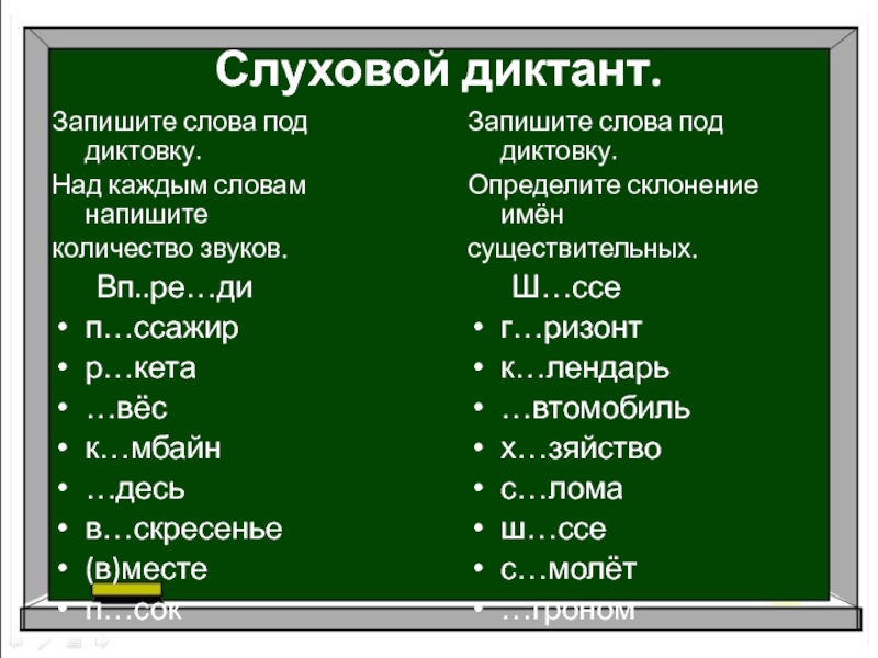 Слуховой диктант – проводится после изучения и закрепления слов, чтобы выяснить, как они усвоены. В результате выявляются пробелы в знаниях учеников и намечаются пути их устранения.