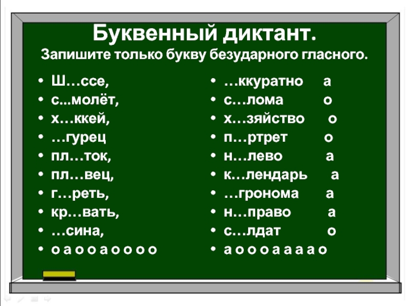 Быстр…, до свидани…, здра…ствуйте, се…одня, …днажды, вдру…, чу…ство, вес…л…, в…зде, вмест…, в…кру…, вп…реди, г…тов, за…тра, …десь, инт…ресный, медл…нно, н…за…, н…лев…, н…прав…, п…том, пр…кра…ный, х…роший .