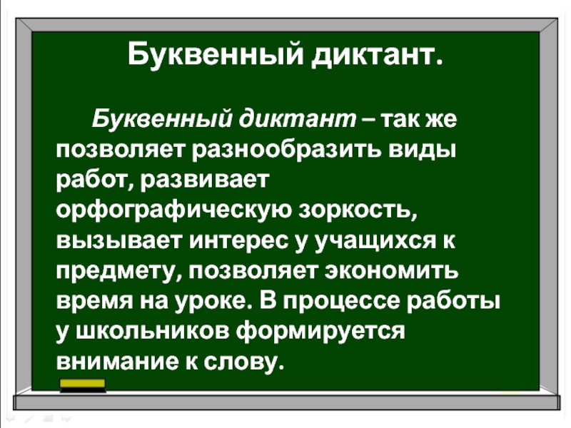 Буквенный диктант – так же позволяет разнообразить виды работ, развивает орфографическую зоркость, вызывает интерес у учащихся к предмету, позволяет экономить время на уроке. В процессе работы у школьников формируется внимание к слову.
