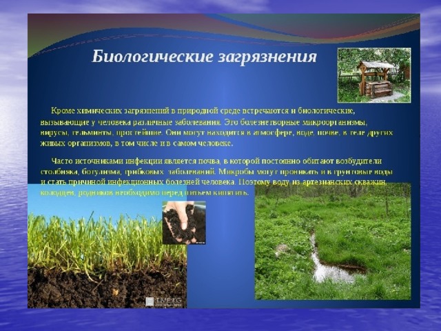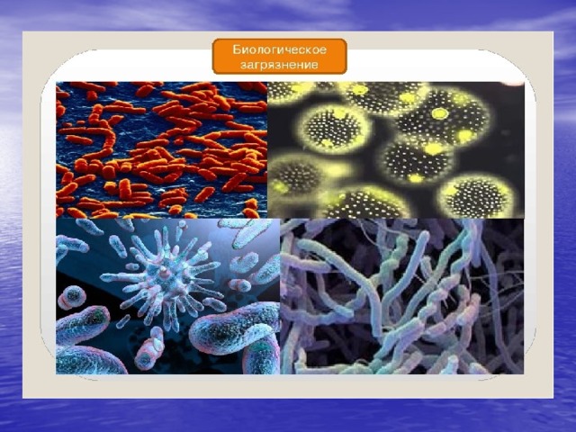 Кроме химических загрязнителей, в природной среде встречаются и биологические, вызывающие у человека различные заболевания. Это болезнетворные микроорганизмы, вирусы, гельминты, простейшие. Они могут находиться в атмосфере, воде, почве, в теле других живых организмов, в том числе и в самом человеке.