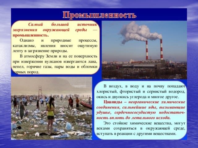 Деятельность человека все чаще становится основным источником загрязнения биосферы. В природную среду во все больших количествах попадают газообразные, жидкие и твердые отходы производств. Различные химические вещества, находящиеся в отходах, попадая в почву, воздух или воду, переходят по экологическим звеньям из одной цепи в другую, попадая в конце концов в организм человека.