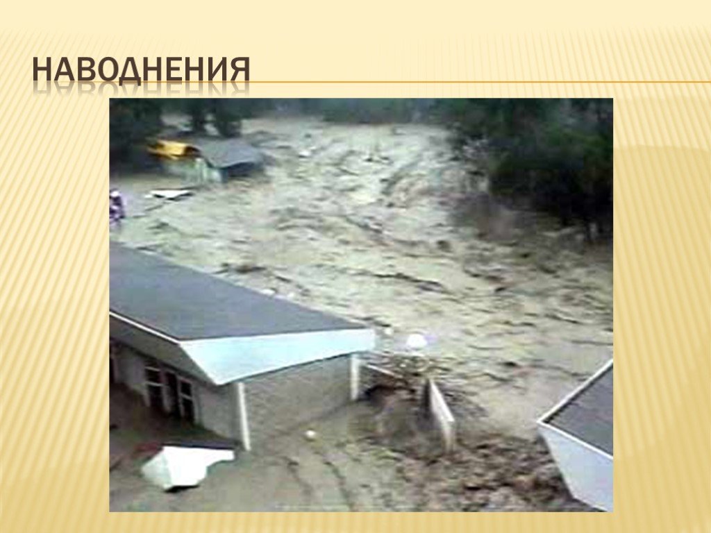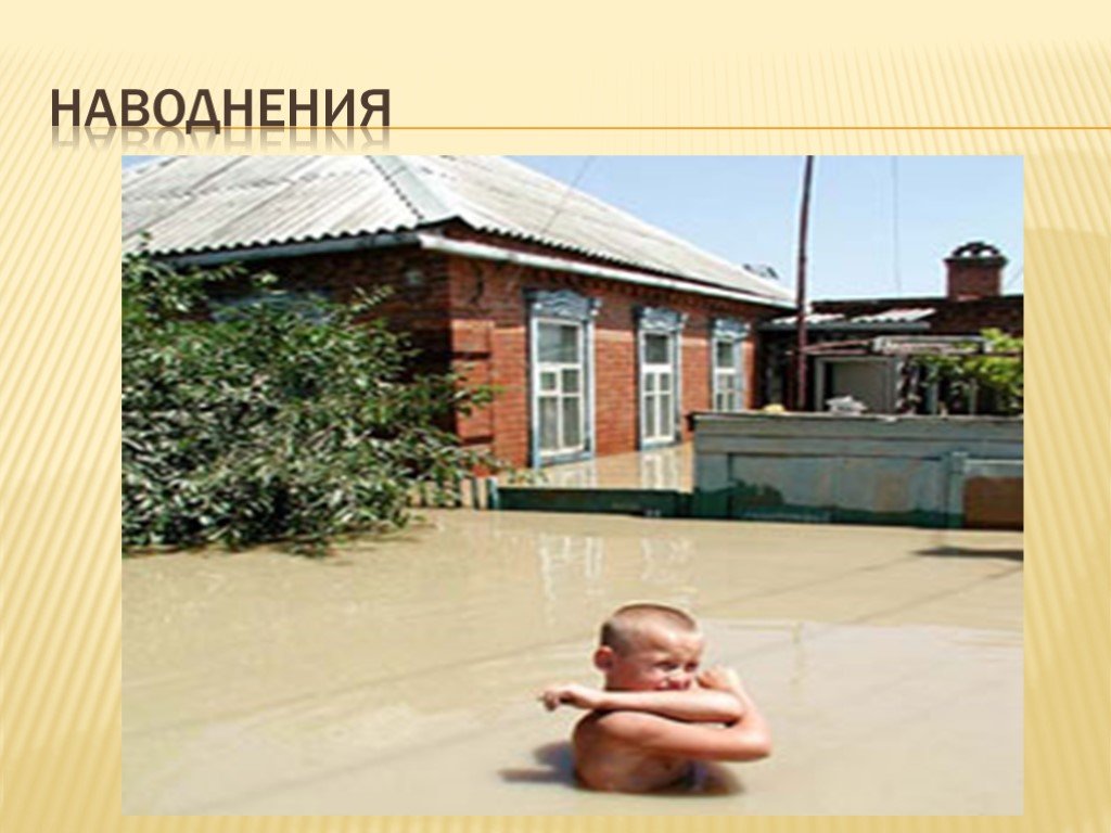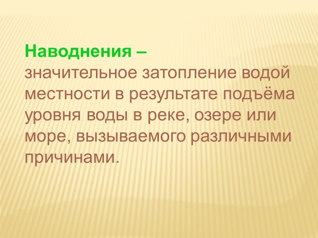 Наводнения – значительное затопление водой местности в результате подъёма уровня воды в реке, озере или море, вызываемого различными причинами.