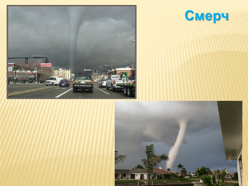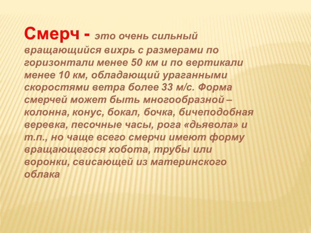 Смерч - это очень сильный вращающийся вихрь с размерами по горизонтали менее 50 км и по вертикали менее 10 км, обладающий ураганными скоростями ветра более 33 м/с. Форма смерчей может быть многообразной – колонна, конус, бокал, бочка, бичеподобная веревка, песочные часы, рога «дьявола» и т.п., но чаще всего смерчи имеют форму вращающегося хобота, трубы или воронки, свисающей из материнского облака