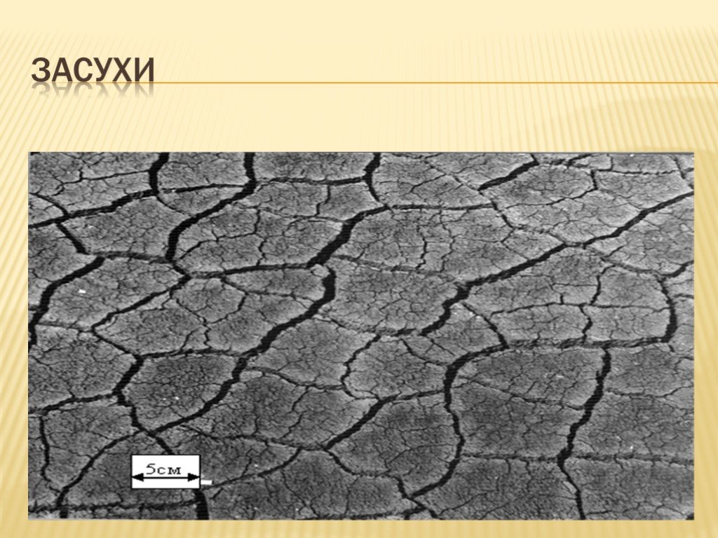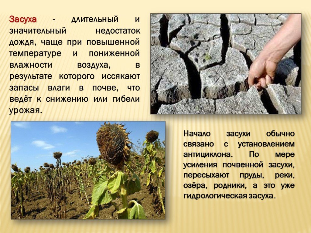 Засуха - длительный и значительный недостаток дождя, чаще при повышенной температуре и пониженной влажности воздуха, в результате которого иссякают запасы влаги в почве, что ведёт к снижению или гибели урожая.