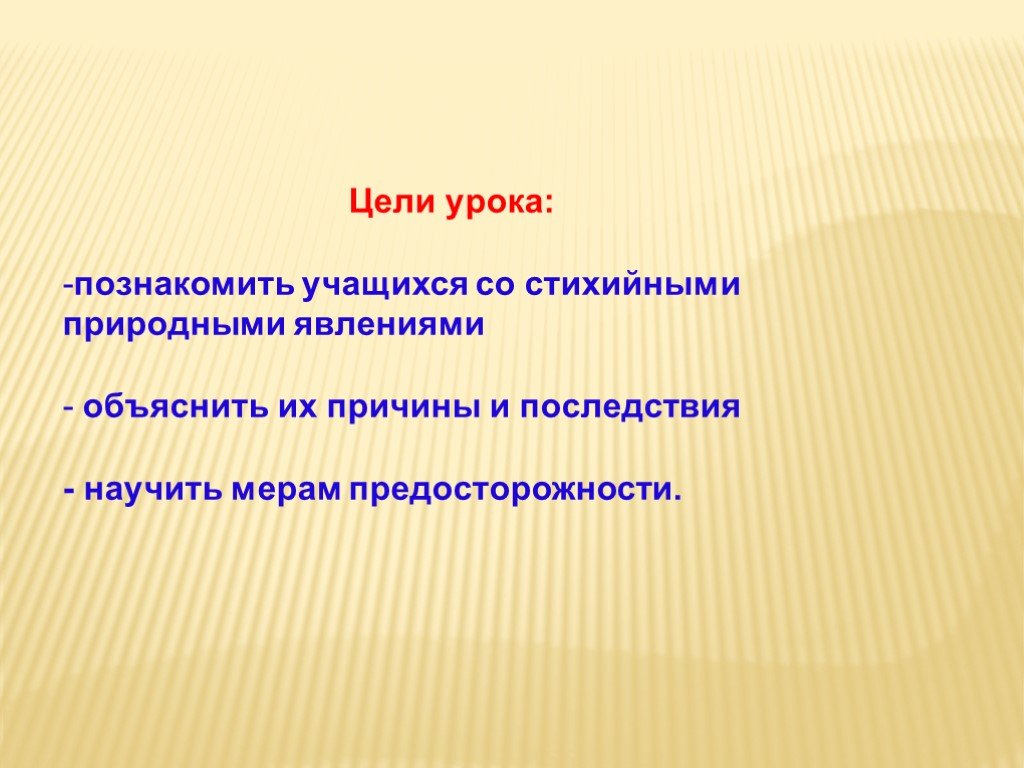 Цели урока: познакомить учащихся со стихийными природными явлениями объяснить их причины и последствия - научить мерам предосторожности.