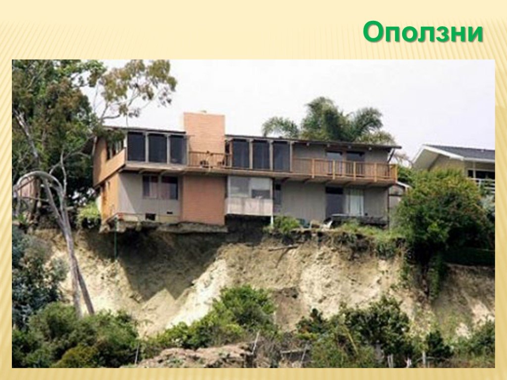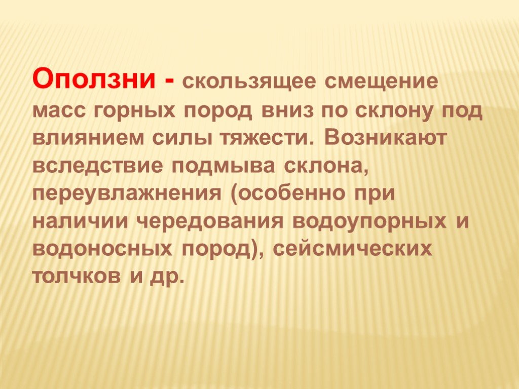 Оползни - скользящее смещение масс горных пород вниз по склону под влиянием силы тяжести. Возникают вследствие подмыва склона, переувлажнения (особенно при наличии чередования водоупорных и водоносных пород), сейсмических толчков и др.