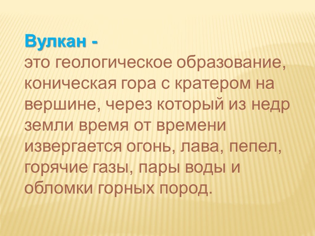 Вулкан - это геологическое образование, коническая гора с кратером на вершине, через который из недр земли время от времени извергается огонь, лава, пепел, горячие газы, пары воды и обломки горных пород.