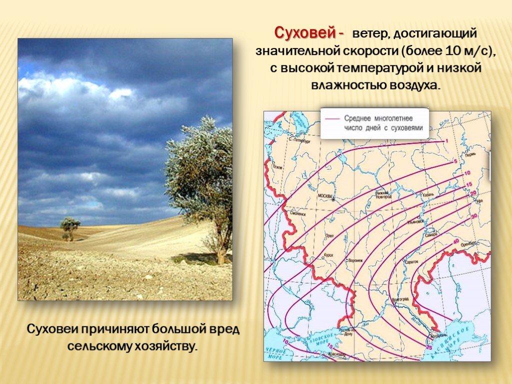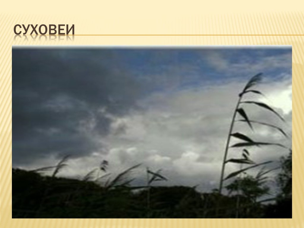 Суховей - ветер, достигающий значительной скорости (более 10 м/с), с высокой температурой и низкой влажностью воздуха.