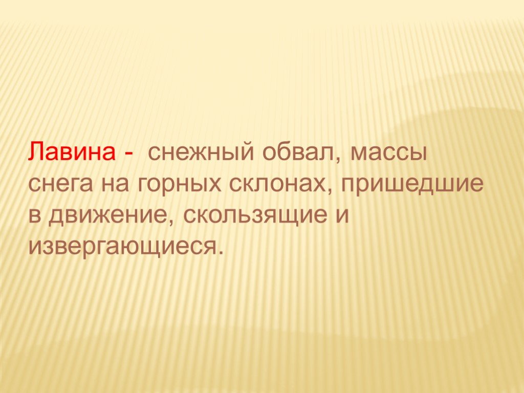 Лавина - снежный обвал, массы снега на горных склонах, пришедшие в движение, скользящие и извергающиеся.