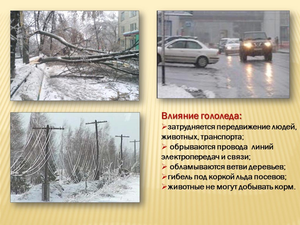 Влияние гололеда: затрудняется передвижение людей, животных, транспорта; обрываются провода линий электропередач и связи; обламываются ветви деревьев; гибель под коркой льда посевов; животные не могут добывать корм.
