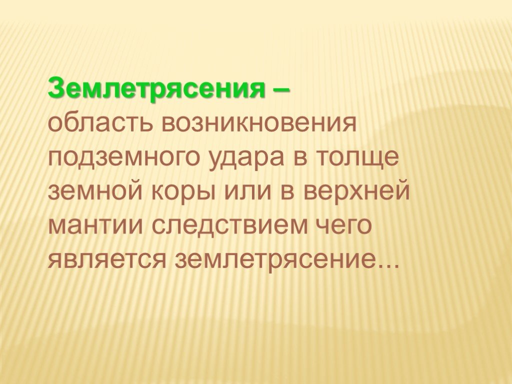 Землетрясения – область возникновения подземного удара в толще земной коры или в верхней мантии следствием чего является землетрясение.