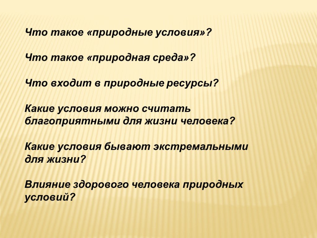 Что такое «природные условия»? Что такое «природная среда»? Что входит в природные ресурсы? Какие условия можно считать благоприятными для жизни человека? Какие условия бывают экстремальными для жизни? Влияние здорового человека природных условий?