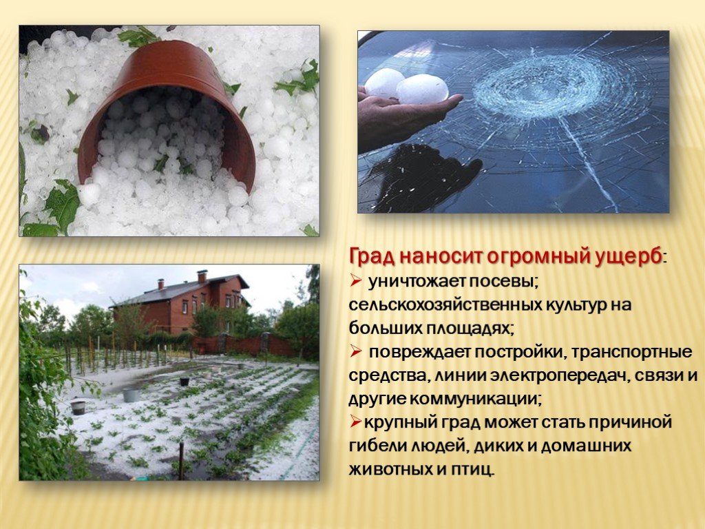 Град наносит огромный ущерб: уничтожает посевы; сельскохозяйственных культур на больших площадях; повреждает постройки, транспортные средства, линии электропередач, связи и другие коммуникации; крупный град может стать причиной гибели людей, диких и домашних животных и птиц.