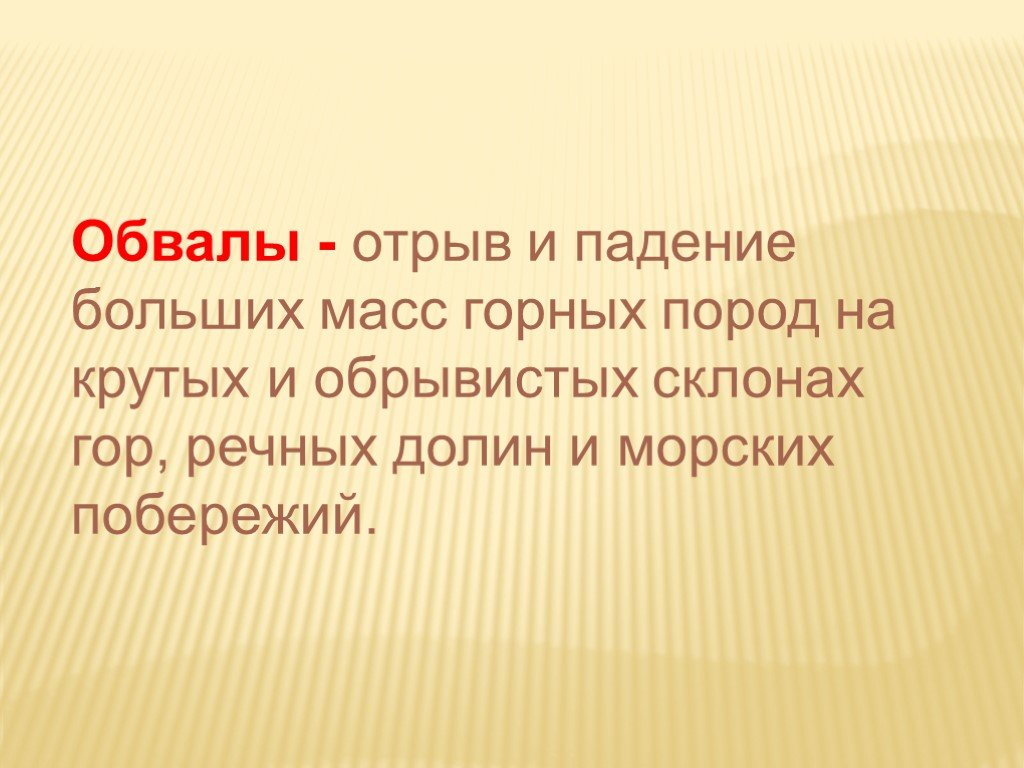 Обвалы - отрыв и падение больших масс горных пород на крутых и обрывистых склонах гор, речных долин и морских побережий.
