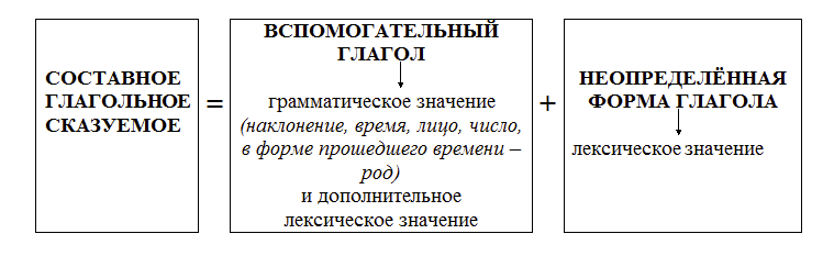(Составное глагольное сказуемое состоит из вспомогательного глагола, который выражает грамматическое значение, и неопределенной формы, выражающей лексическое значение сказуемого.)