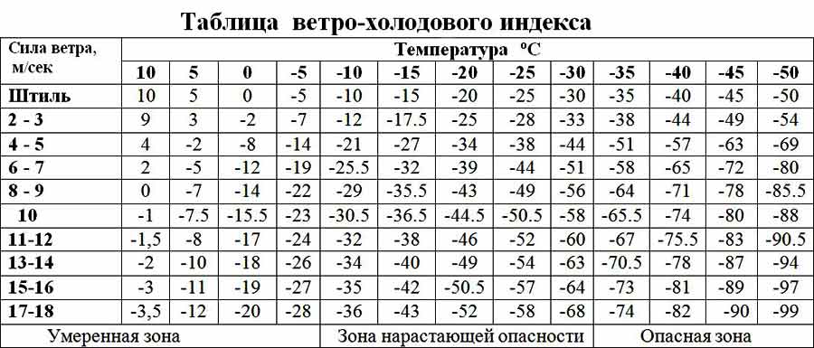 Для удобства разработана специальная таблица ветро-холодового индекса.