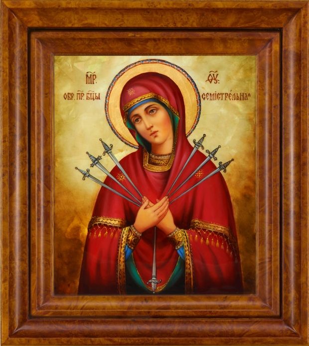 Богоматерь изображена стоящей на облаке с семью пронзившими сердце мечами: по три справа и слева и один внизу. Существуют и поясные изображения Богородицы. Число семь означает полноту горя, печали и сердечной боли, испытанных Богородицей в её земной жизни. Иногда образ пополнен изображением на коленях Богоматери умершего Богомладенца.