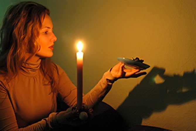 Простое и знакомое многим гадание. Берут газетный лист, подойдет и обычный А4 белый. Мнут в руках, придавая форму шара. Плотно мять не надо. Лист мнет тот, кому предсказывают. Затем положите бумажный ком на тарелку, она должна быть очень плоской, можно просто перевернуть обычную. Тарелку ставят рядом со стеной. Бумагу поджигают, и ждут, когда она прогорит. За тарелкой поставьте свечу. Смотрите на тень, по ней и предсказывают будущее. Тень формируется сгоревшей бумагой. Значение фигур совпадает с толкованием фигур при гадании на воске.