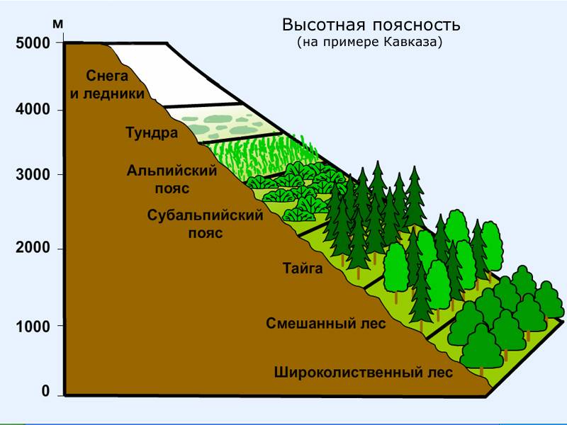 Есть еще одно очень интересное явление смены природных зон — это высотная поясность. Оно возникает на территориях, где возвышаются горы. Суть явления заключается в том, что климат и погодные условия меняются по мере не горизонтального, а вертикального перемещения. Яркий пример — когда у подножья горы стоит удушающая жара и земля покрыта густой растительностью, лесами и травами, а на вершине — мороз, залежи льда и снега, сильные ветра и отсутствует какая-либо зелень.