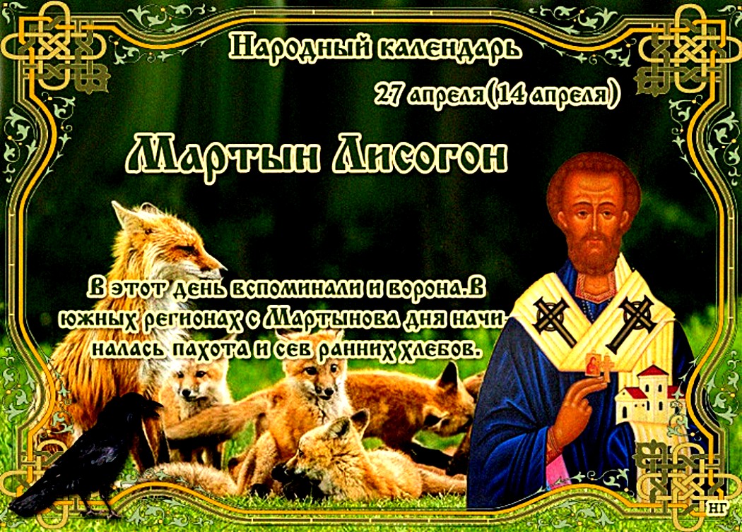 В приметах на 27 апреля, словно бы в русских народных сказках, фигурируют образы лис, ворон и даже журавлей. В календаре наших пращуров день получил разные названия: «Мартын-лисогон», «вороний праздник», «Мартын», «птичьи обереги». Считается, что с этой даты начинаются настоящие грозы, какие бывают летом. Православная церковь сегодня чтит память святого Мартина Исповедника.