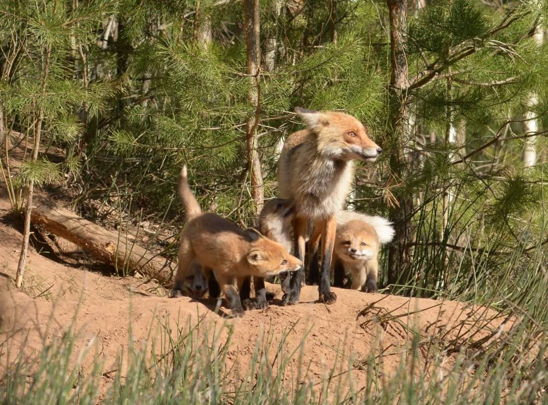 Лисицы роются между пней, бегут на людей.