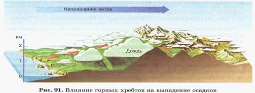 4. Зависимость климата от высоты местности над уровнем моря и рельефа. Большое влияние на климат оказывает не только высота над уровнем моря, но и расположение горных хребтов. Например, горы Гималаи протянулись с запада на восток. С Индийского океана на север дуют влажные ветры, нона пути они встречают мощную преграду в виде гор. Теплый влажный воздух, доходя до них, поднимается вверх по склонам и охлаждается; при этом образуются облака, из которых выпадают осадки. На южных склонах Гималаев выпадает огромное количество осадков; в Черапунджи, например, до 12 тыс. мм в год. Перевалив через хребет, воздух опускается и нагревается. Конденсации водяного пара не происходит, поэтому осадки не выпадают. К северу от Гималаев раскинулись безводные пустыни.
