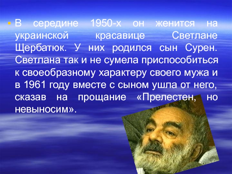 В середине 1950-х он женится на украинской красавице Светлане Щербатюк. У них родился сын Сурен. Светлана так и не сумела приспособиться к своеобразному характеру своего мужа и в 1961 году вместе с сыном ушла от него, сказав на прощание «Прелестен, но невыносим».