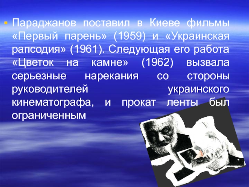 Презентация на тему Презентация на тему Сергей Параджанов, предмет презентации: Образование. Этот материал содержит 10 слайдов. Красочные слайды и илюстрации помогут Вам заинтересовать свою аудиторию. Для просмотра воспользуйтесь проигрывателем, если материал оказался полезным для Вас - поделитесь им с друзьями с помощью социальных кнопок и добавьте наш сайт презентаций ThePresentation.ru в закладки!