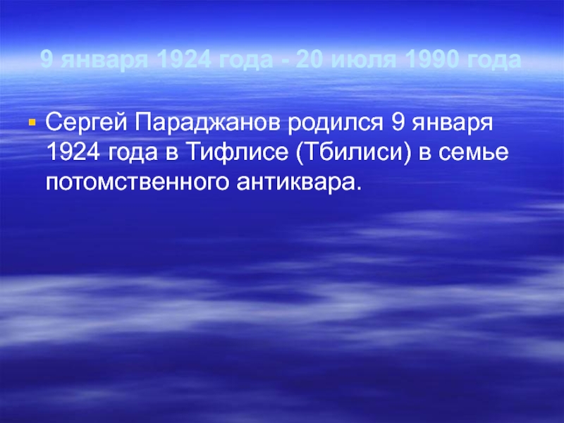 Сергей Параджанов родился 9 января 1924 года в Тифлисе (Тбилиси) в семье потомственного антиквара.