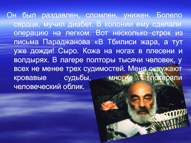 Он был раздавлен, сломлен, унижен. Болело сердце, мучил диабет. В колонии ему сделали операцию на легком. Вот несколько строк из письма Параджанова «В Тбилиси жара, а тут уже дожди! Сыро. Кожа на ногах в плесени и волдырях. В лагере полторы тысячи человек, у всех не менее трех судимостей. Меня окружают кровавые судьбы, многие потеряли человеческий облик.