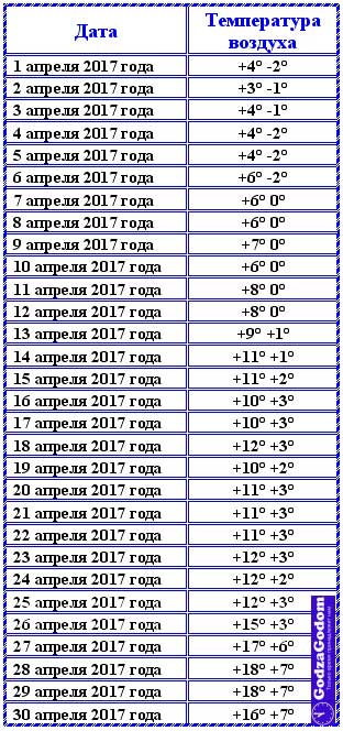 Для удобства вся информация представлена в виде текстовых описаний, графиков и таблиц. Таким образом, вы увидите график температуры и таблицу погоды для города Москва в апреле 2017 года. Помните, что другой город и другую дату можно выбрать в меню сайта.