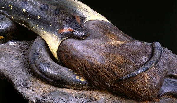 Благодаря сложному устройству челюстей и глотки, оснащенных эластичными связками, анаконда способна проглотить добычу превышающую ее в размерах. Однако это не всегда бывает просто, и добыча таких габаритов сама в рот не пойдет. Бывает наоборот — при попытке напасть, к примеру, на жертвой становится она сама. Но факт остается фактом.