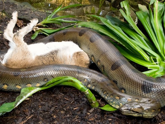 Далее она просто заглатывает свою добычу целиком и переваривает ее. Теперь ей нет нужды беспокоится о своем пропитании на неделю, а то и месяцы вперед. Она будет постепенно насыщаться и получать питательные вещества, потихоньку переваривая содержимое желудка в пассивном лежачем положении. Желудочные кислоты настолько сильны, что перевариваются даже кости. В следующий раз отобедать анаконда захочет не скоро.